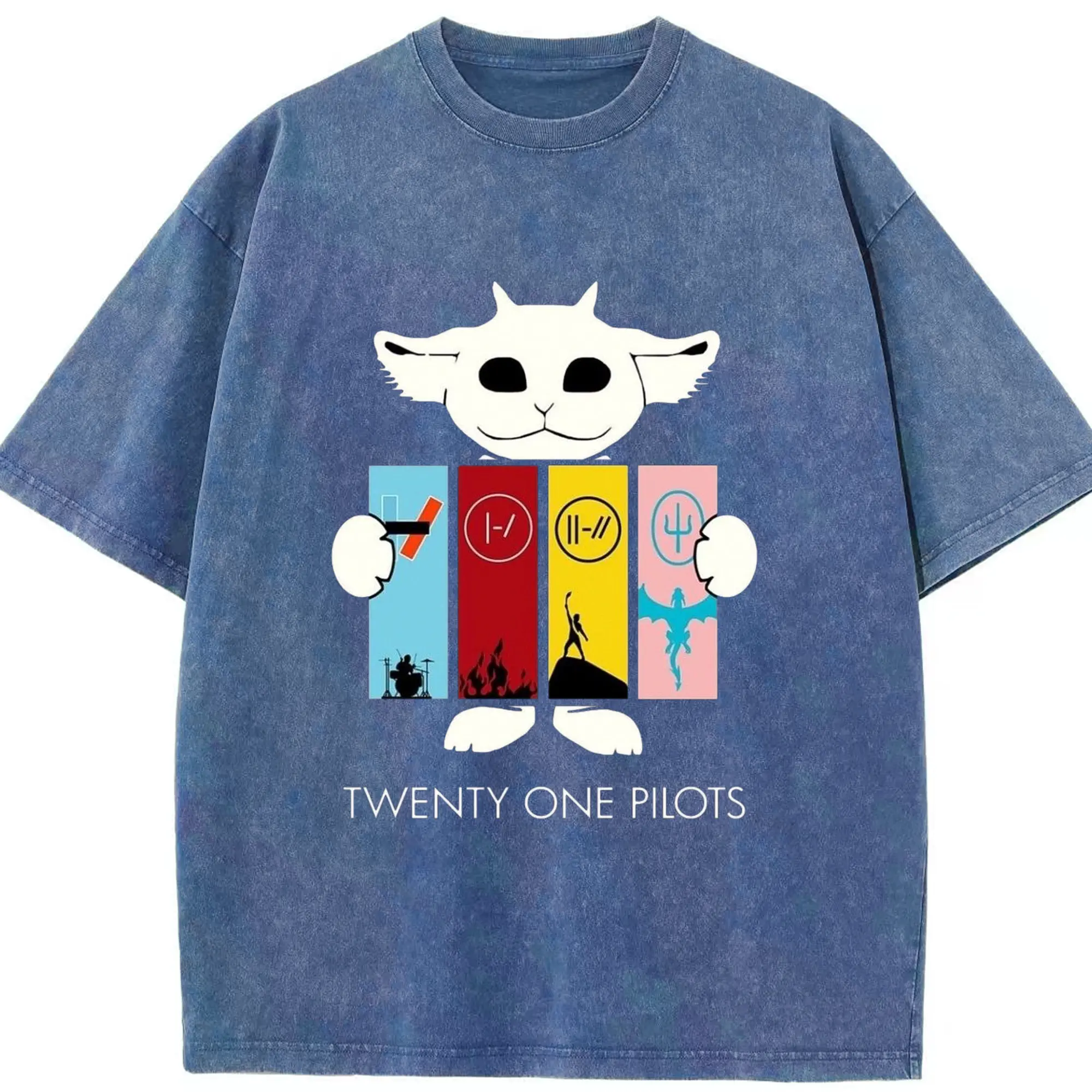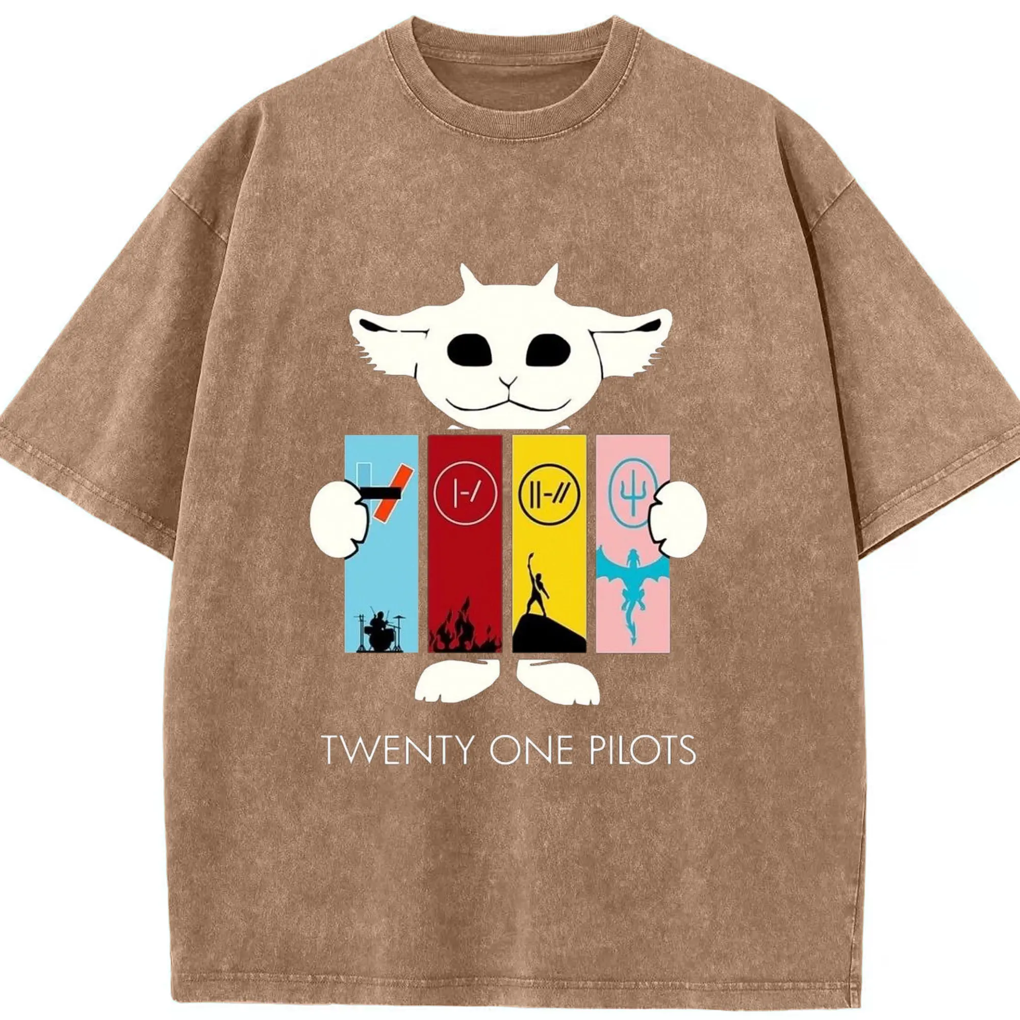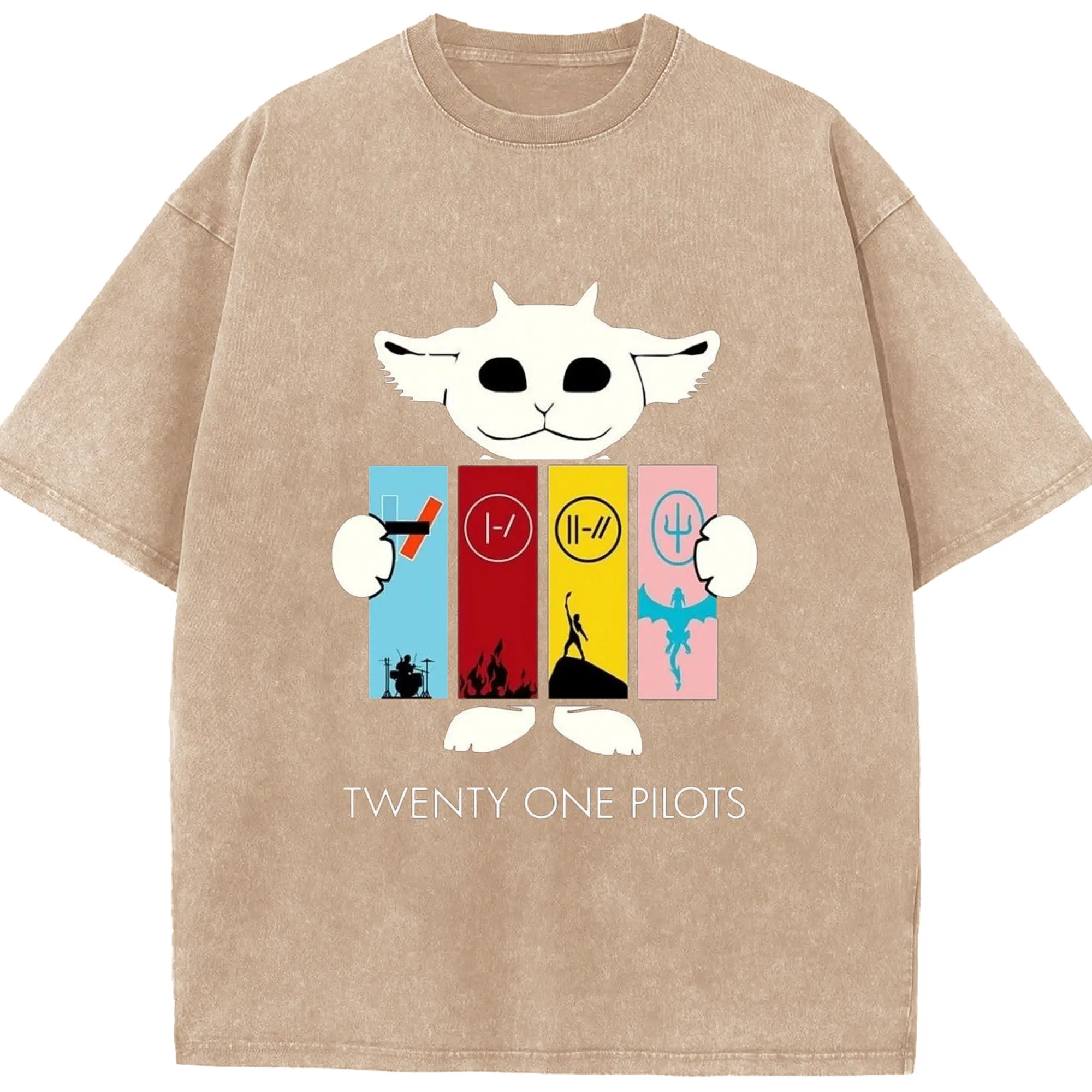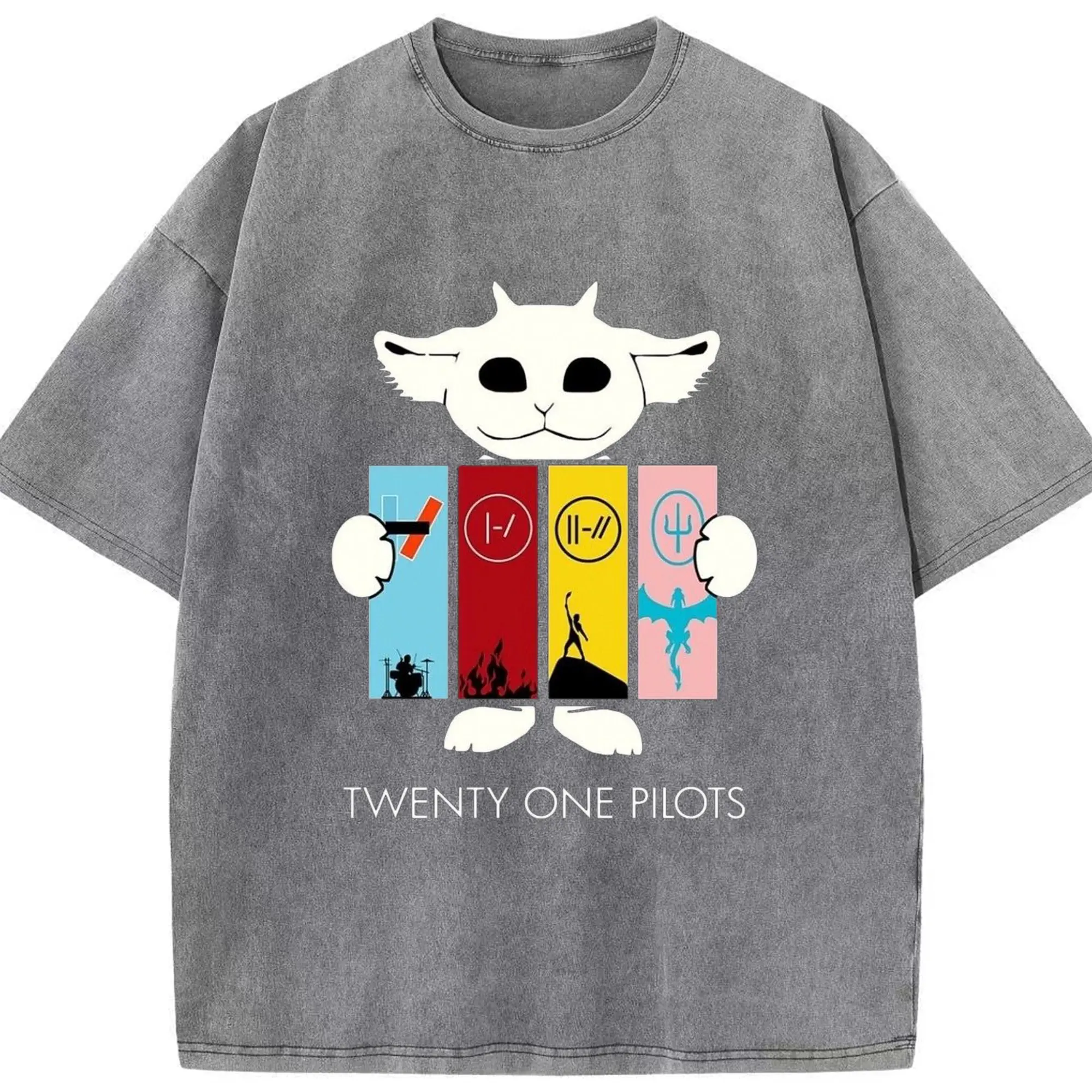 Twenty One Pilots Monster Cartoon Rock DIY - Washed Vintage Look 230g Cotton Oversized T-Shirt With Front Heat Transfer Print – Soft, Lightweight, Stylish Fit – Comfortable Casual Wear For Sports & Everyday Use