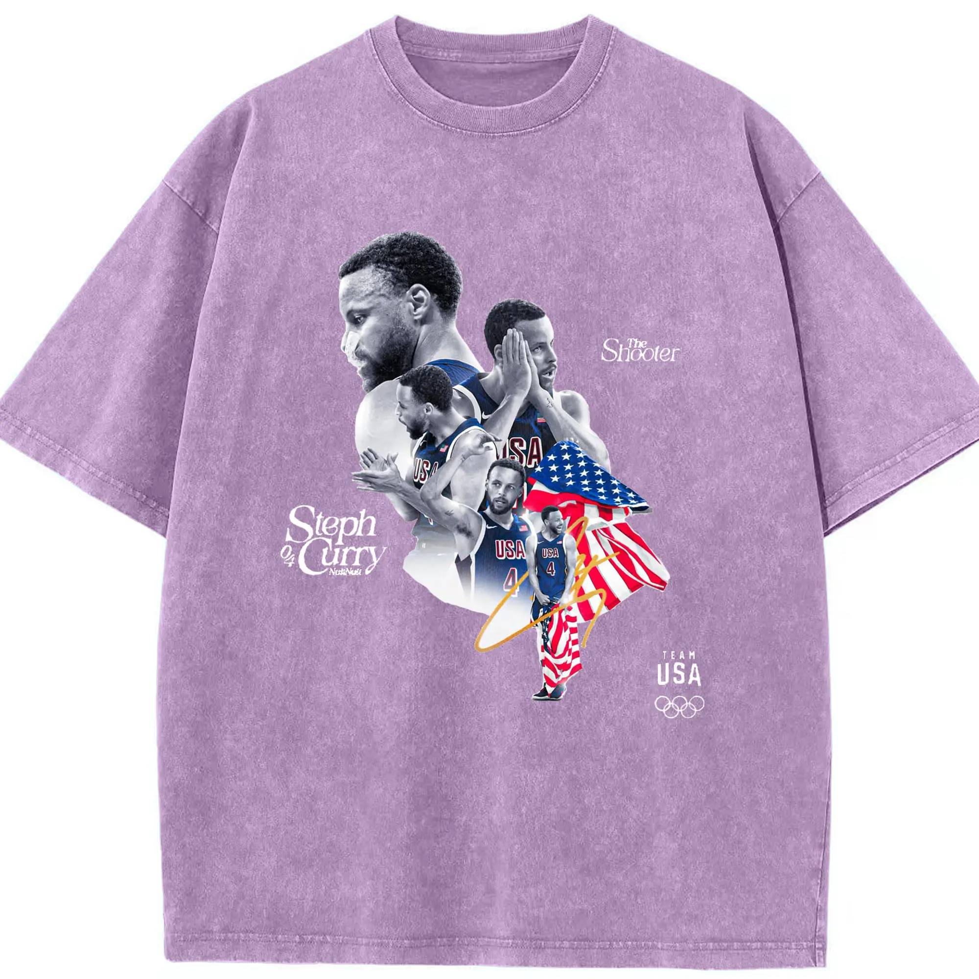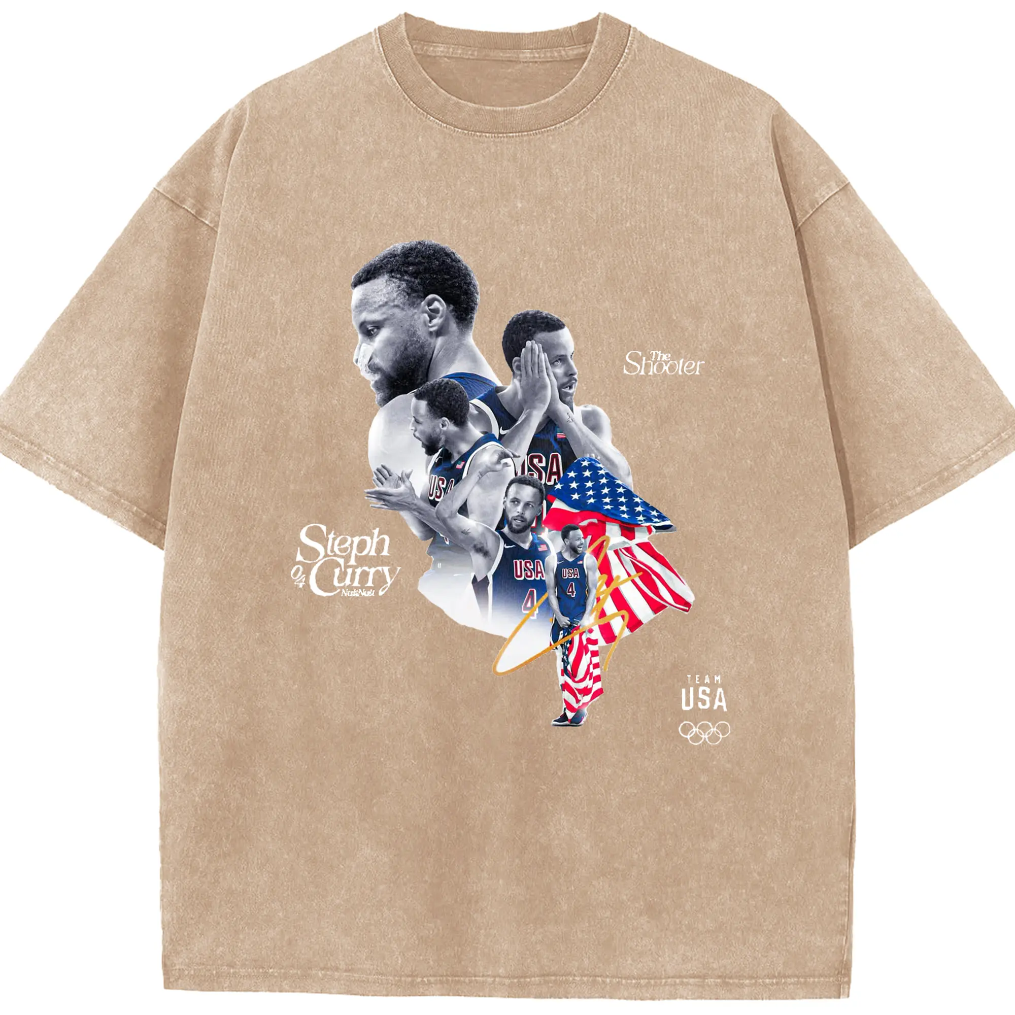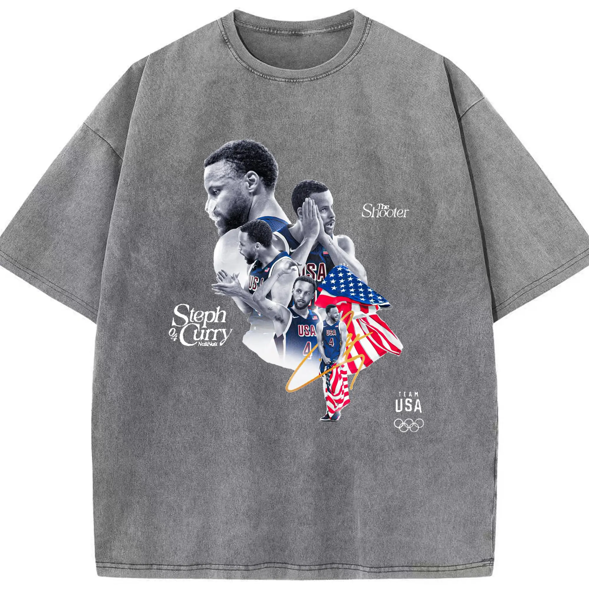 USA Basketball Curry #4 Shirt - Washed Vintage Look 230g Cotton Oversized T-Shirt With Front Heat Transfer Print – Soft, Lightweight, Stylish Fit – Comfortable Casual Wear For Sports & Everyday Use